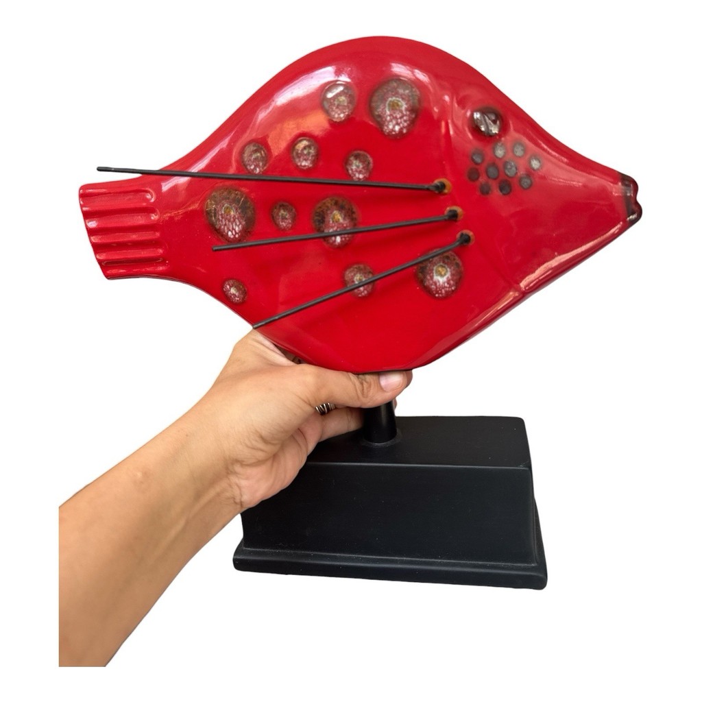 Vintage Mid Century Modern Red Ceramic Metal Fish Sculpture Modernist Studio