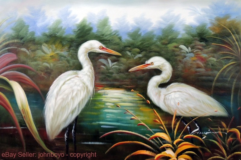Painting: White Heron Egret Pair In Florida Everglades Swamp Stretched 24X36 Oil Painting