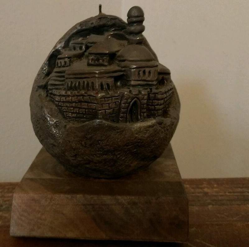Vintage Metal Sculpture Ancient City Carved Out Of Rock Wood Base Velvet Bottom