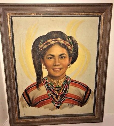 Painting: Philippine Tribal Portrait Oil Painting Vintage 1969 Celso Rewes Girl Beads