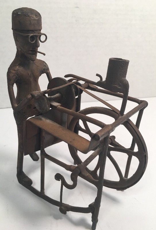 Sculpture: Vintage Metal Sculpture Smoking Man 7"" Tall.Sharpening Knife Handmade