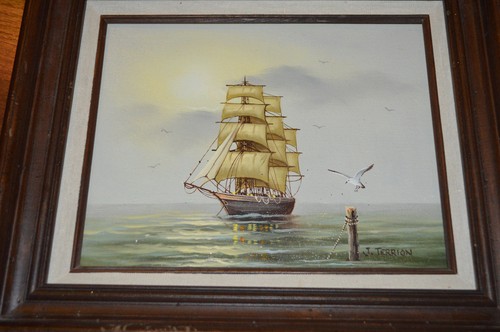 Vintage Original Early John Terrion Nautical Seascape Ship Oil Painting Canvas