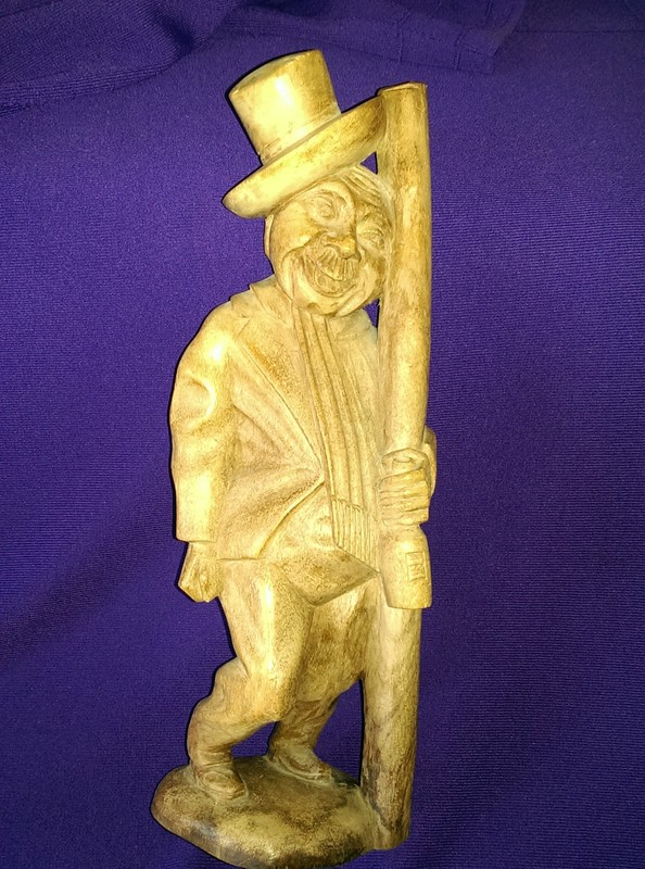 Sculpture: 13""X4.5"" Vintage Wooden Hand-Carved Drunk Man Holding Onto Pole With Bottle