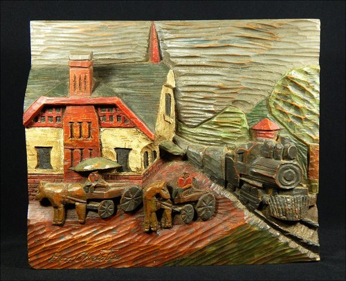 Sculpture: Amazing Folk Art Carved Wooden Bas Relief Plaque Don Christie Train Horse Wagon