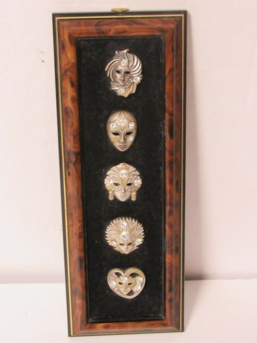 Art Deco Miniature Metal Masks Metal W/ Jewels Mounted On Black Velveteen Framed