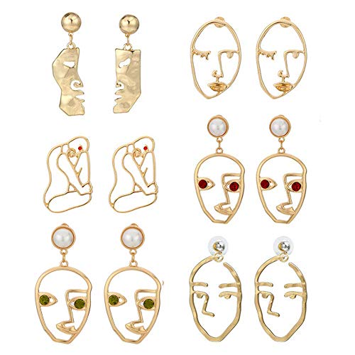 Boer Inc 6 Pair Human Face Earrings Unique Abstract Art Dangle Stud Earring Fashion Geometric Drop Hoops Studs Earrings With Face Rings For Party Birthday Valentines Day (6Pcs)