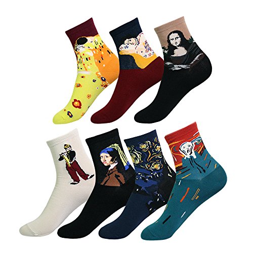 Fashion: Kony Womens 7 Pairs Funny Famous Painting Art Printed Multi-Color Patterned Casual Crew Socks Size 6-9 (Famous Painting - 7 Pairs)