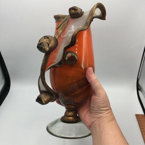 Signed Diroulu Brutalist Art Glass Vase Primitive Mixed Media Metal Sculpture