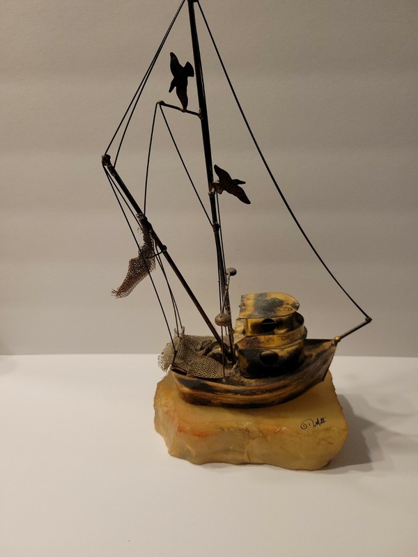 Demott Signed Vintage Metal Sculpture Fishing Trawler