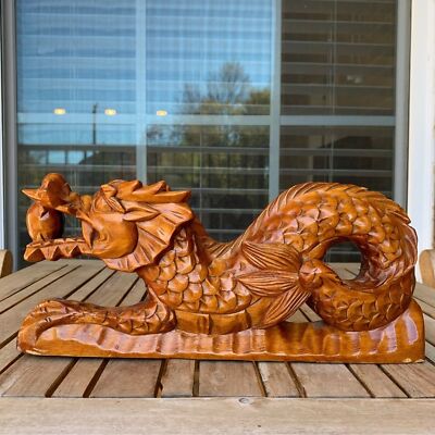 Vintage Chinese Wooden Dragon Statue Wood Carving Sculpture Lunar New Year Lucky