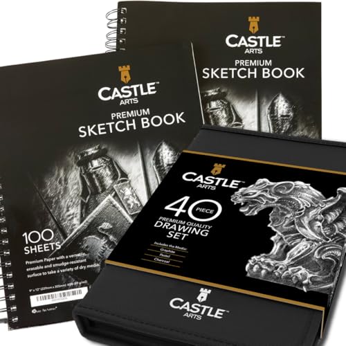 Castle Art Supplies Complete Drawing Essentials Bundle 40 Piece Drawing Supplies With Graphite, Charcoal & Pastels 2 Sketchbooks, 90gsm 9 12 Sketching Set With Case for All Skill Levels