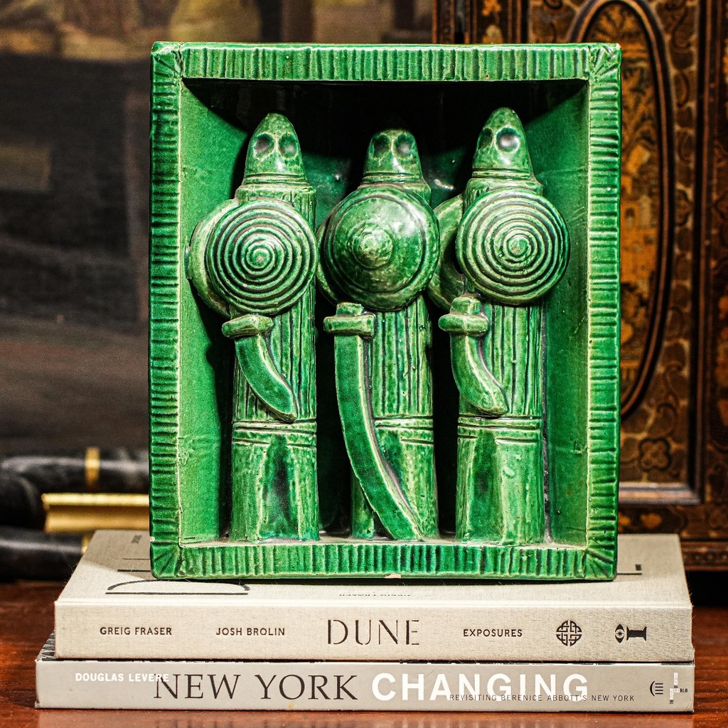 Bold Green Glazed Vintage Ceramic Warrior Sculpture Ancient Abstract Art