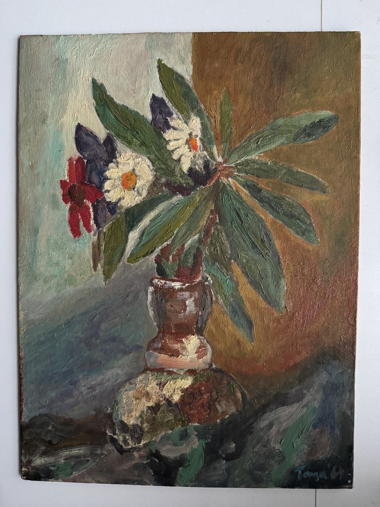 Vintage 1960s Outsider Art Oil Painting On Board Flowers Signed by Artist 16x12