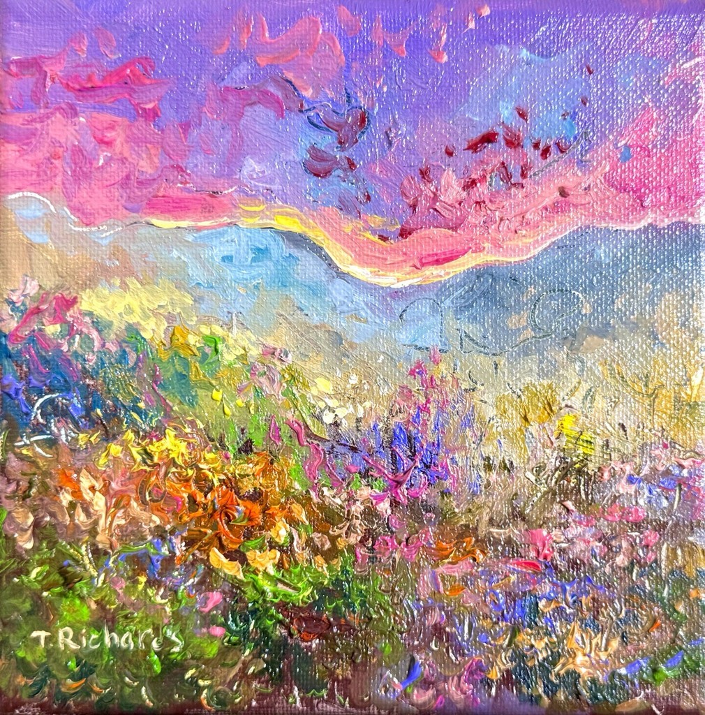 Wildflowers Oil Painting Original art Mountain Sunset Floral Field Landscape 6x6