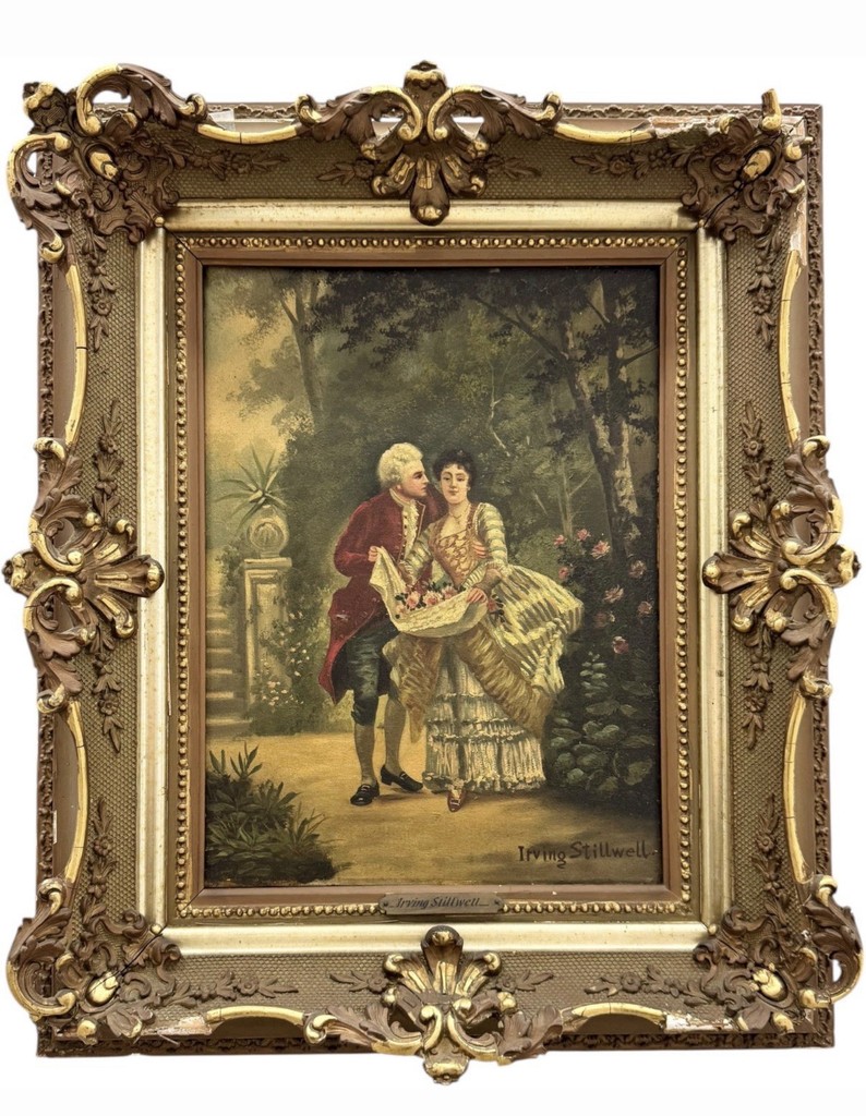 19th Century Oil Painting -American Courting Scene Lovers In Garden